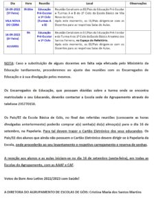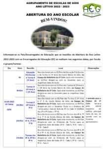ABERTURA DO ANO ESCOLAR 2022/2023 – REUNIÕES DE PAIS/ENCARREGADOS DE EDUCAÇÃO Direção2 Setembro, 20223 Setembro, 2022 Notícias Votos de Bom Ano Letivo 2022/2023 com Saúde! ← Concurso das Atividades de Enriquecimento Curricular (AEC) – 2022/2023 ABERTURA DO ANO ESCOLAR 2022/2023 – REUNIÕES DE PAIS/ENCARREGADOS DE EDUCAÇÃO →