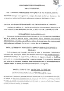 ASSUNTOS: Entrega dos Registos de avaliação; Devolução de Manuais Escolares e dos computadores cedidos pelo Ministério de Educação aos alunos; Matrículas no 10º ano.